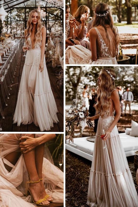 Champagne Wedding Gown W Lace Bodice Plunging Neckline